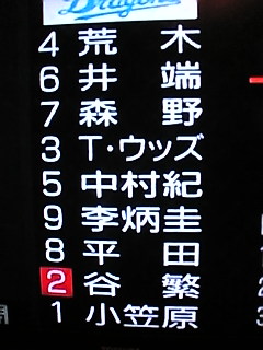 <本塁打>ウッズ1号2点(下柳)=1回・森野1号3点(久保田)=6回