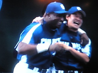 ヒーイン。憲伸投手と森野選手です。投打のヒーロー!