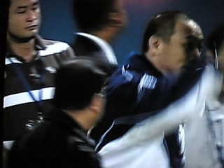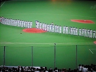 選手整列に監督が向かいます。ドアラ、あんた立ち位置そこ?(苦笑)