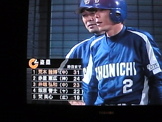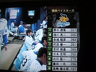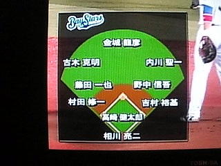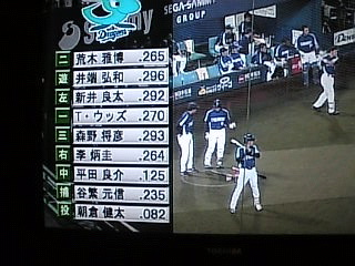 (中)川上、デニー、平井、クルス、岡本、鈴木、石井、久本、高橋、岩瀬-谷繁、清水将