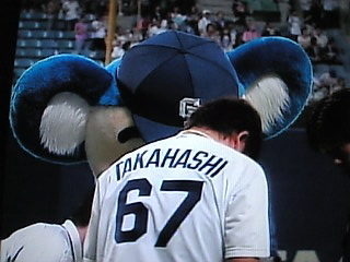 高橋聡文投手のサインボールをチェックするドアラ