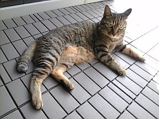 この暑いのに日光浴を欠かさないトラ猫(さりげに日陰にいる^^;;
